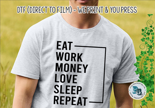 DTF Transfer: Unisex "Eat, Work, Money.." Design