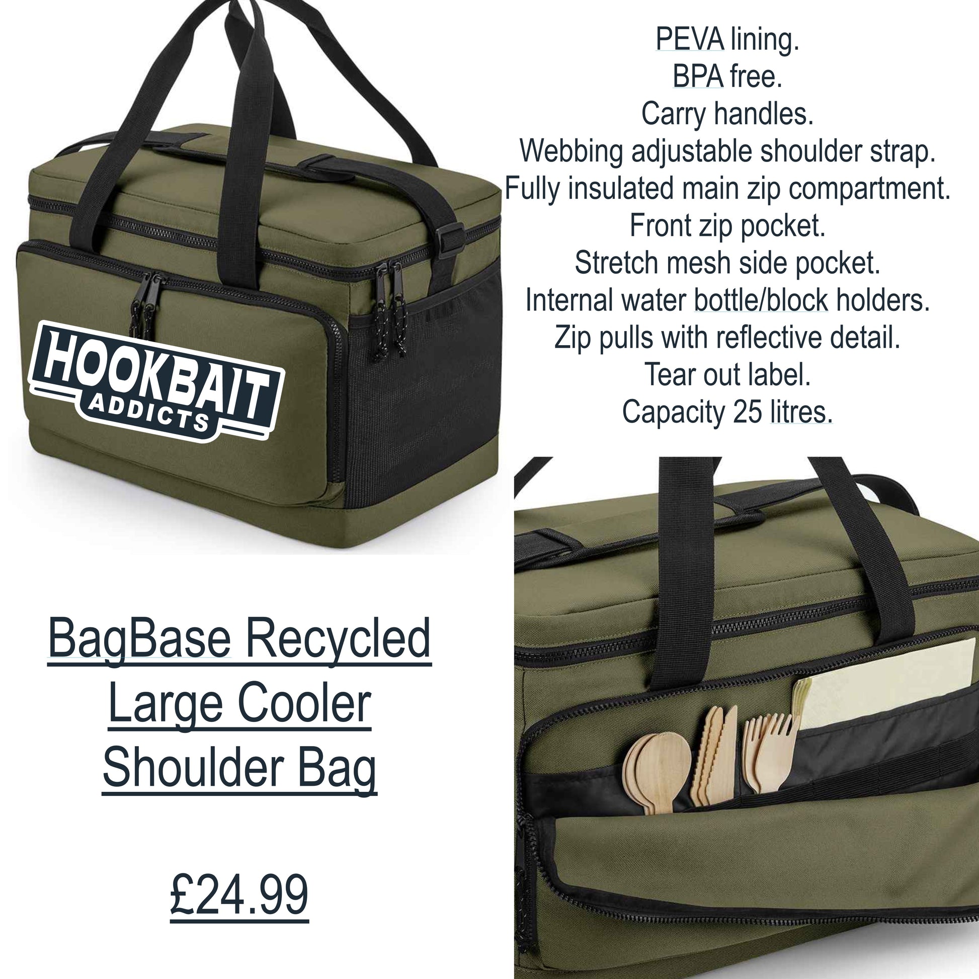 Item #1 - Hookbait Addicts BagBase Recycled Twin Handle Cooler Backpack It offers padded, adjustable shoulder straps for comfortable transport and a fully insulated main compartment with a zip closure to keep your items cool. Additional storage is provided by a front zip pocket, while zip pulls include reflective details for added safety. With a tear-out label and a spacious 16-litre capacity, this backpack is the perfect companion for your outdoor adventures.
